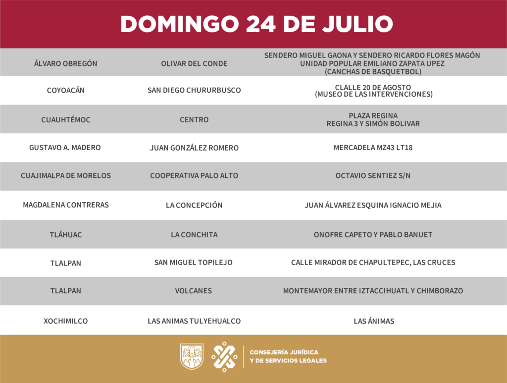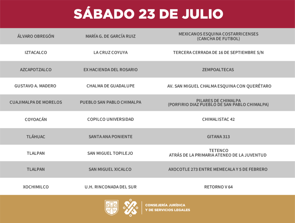 Este es el calendario y ubicaciones para poder acceder a los trámites arriba mencionados en un horario de 10:00 a 14:00 hrs.