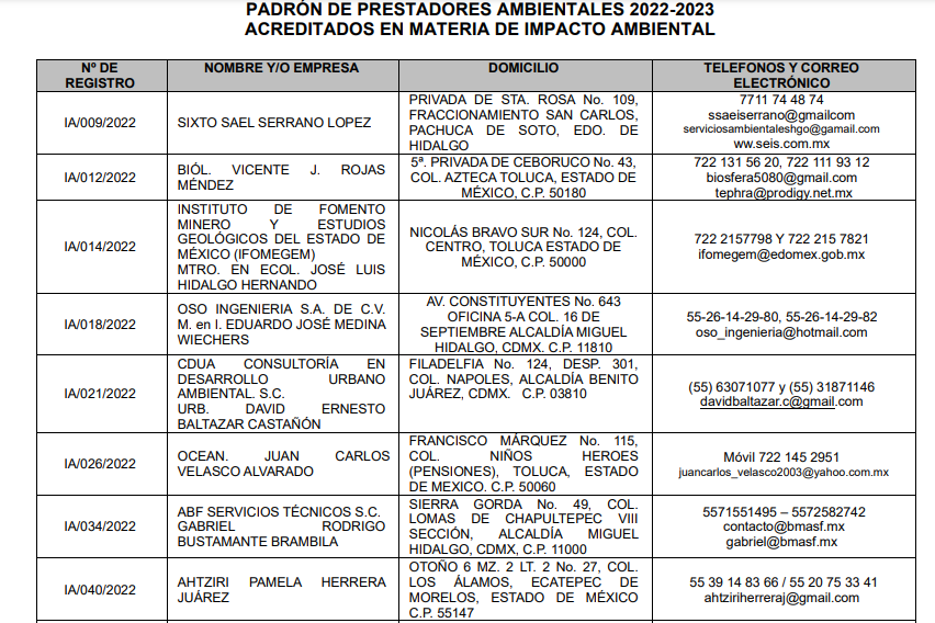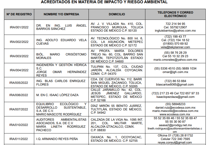 Ya es público y Oficial el listado de las personas físicas y morales autorizadas, registradas y acreditadas por la Secretaría del Medio Ambiente del Estado de México para practicar evaluaciones de impacto ambiental durante 2023.