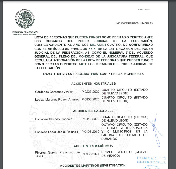 Como cada año el Poder Judicial de la Federación (PJF) publica la lista definitiva de PERITOS que podrán fungir como tal ante este órgano durante el 2024.